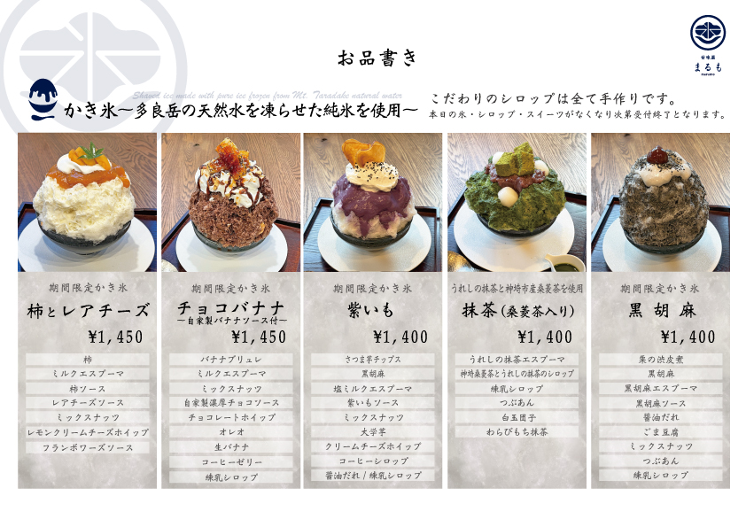 ※本日の氷やスィーツは数量限定となっておりますのでご希望の商品が完売している可能性がございます。ご了承ください。また、その場合早めに営業を終了することもございます。