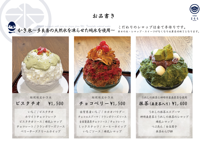 ※本日の氷やスィーツは数量限定となっておりますのでご希望の商品が完売している可能性がございます。ご了承ください。また、その場合早めに営業を終了することもございます。